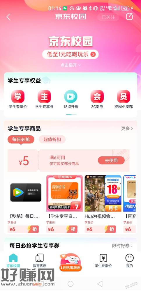 京东校园领6-5,1元腾讯周卡,永和早餐等