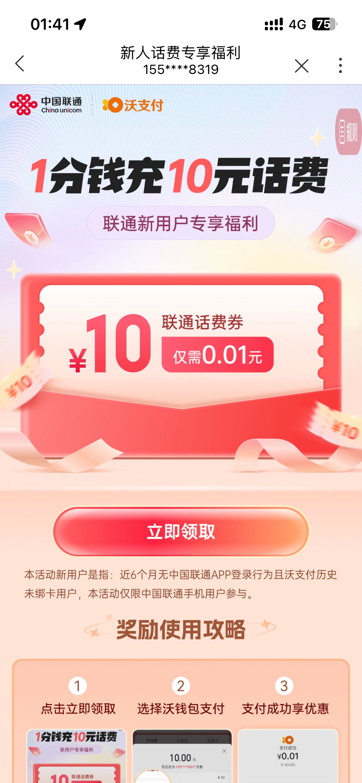 中国联通1分钱充话费 本活动新用户是指:近6个月无中国联通APP登录行为且天支付历史未绑卡用户,本活动仅限中国联通手机用户参与。