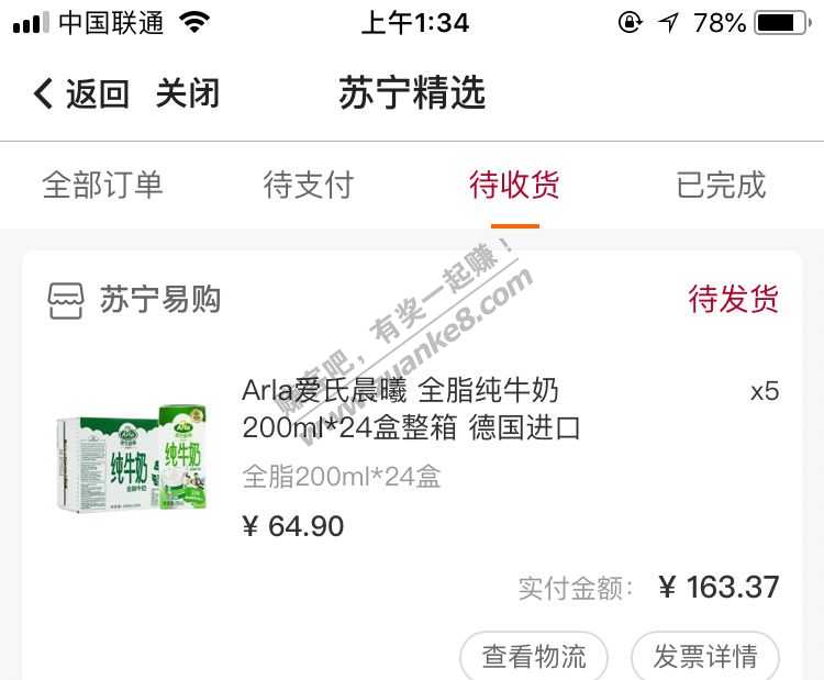 中国银行APP,生活,苏宁精选,Arla爱氏晨曦 全脂纯牛奶200ml*24盒整箱 德国进口,领40-20和199-60券,叠加使用,下5件,合163.37元