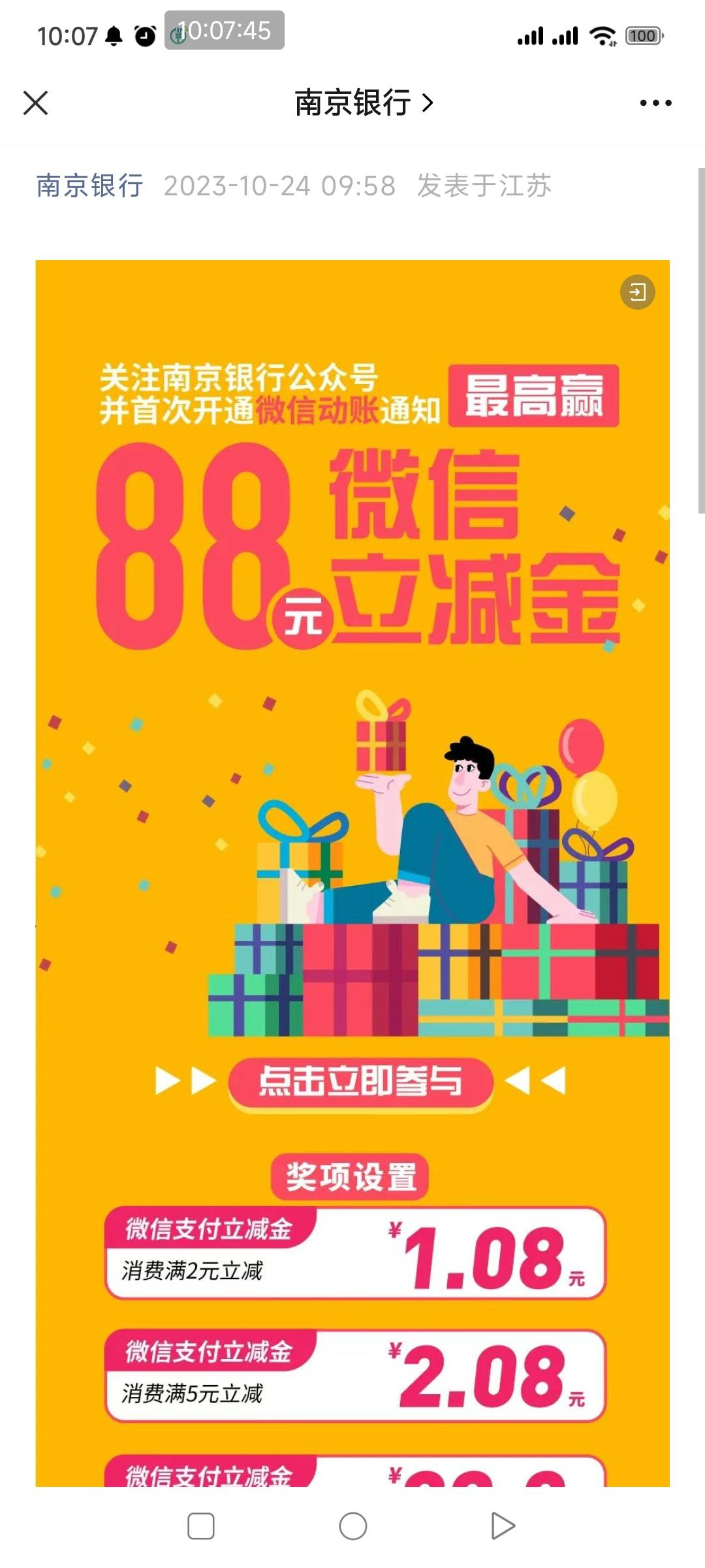 南京银行公众号历史第一条首次开微信动账,抽1.08到88