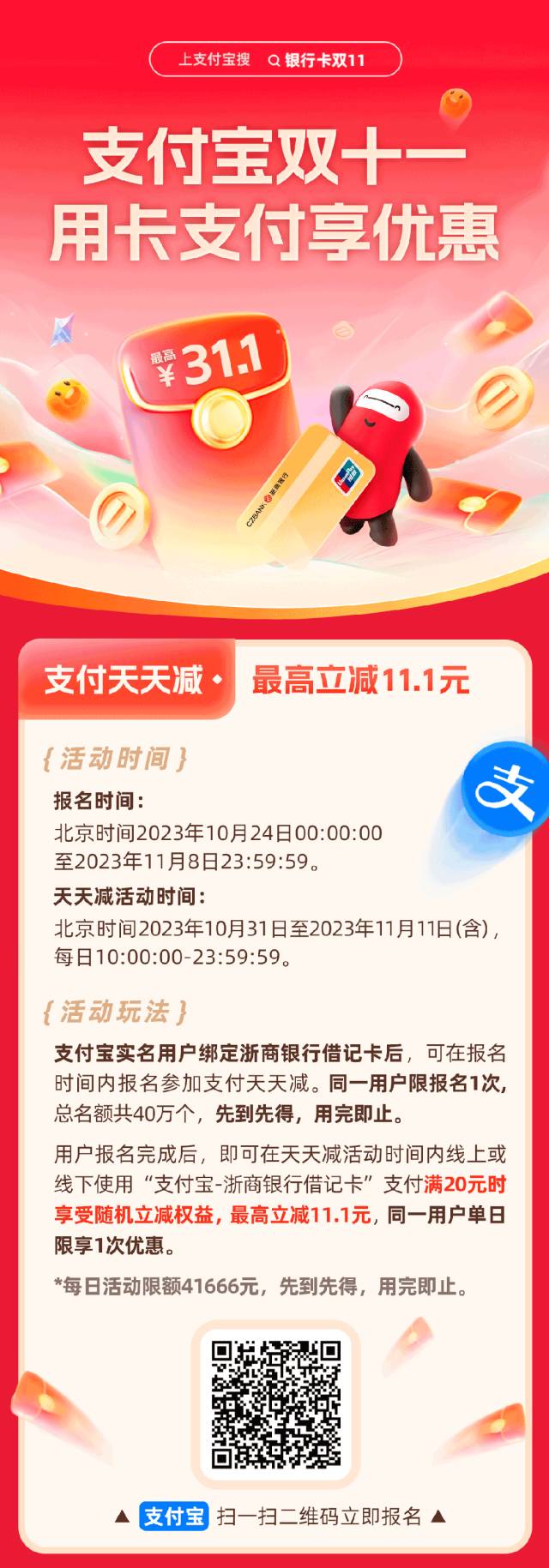 【浙商银行借记卡】随机最高减11.1元,尾款加享10元立减!支付宝消费天天减,助您嗨购双11