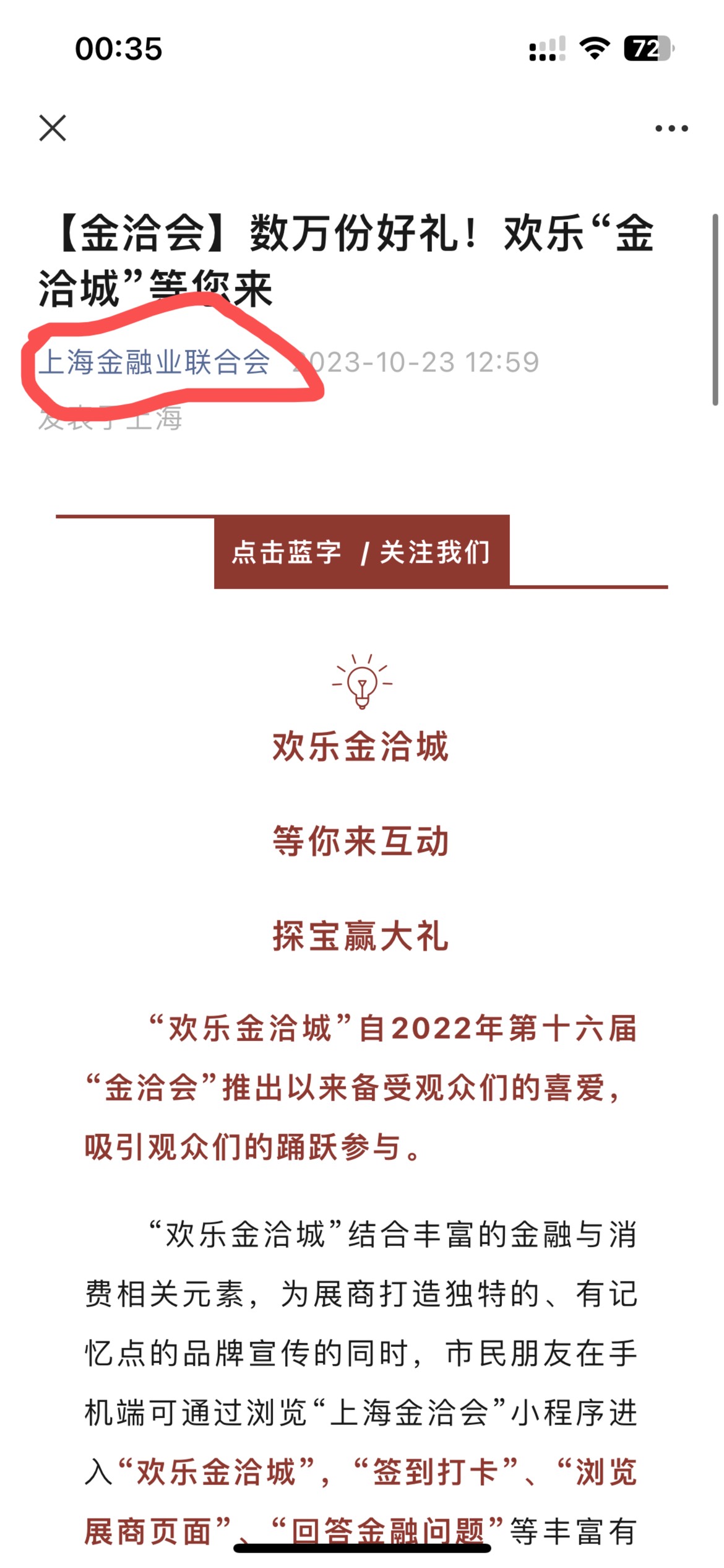 上海金融业联合会公众号23号推文,欢乐金洽城完成任务抽奖