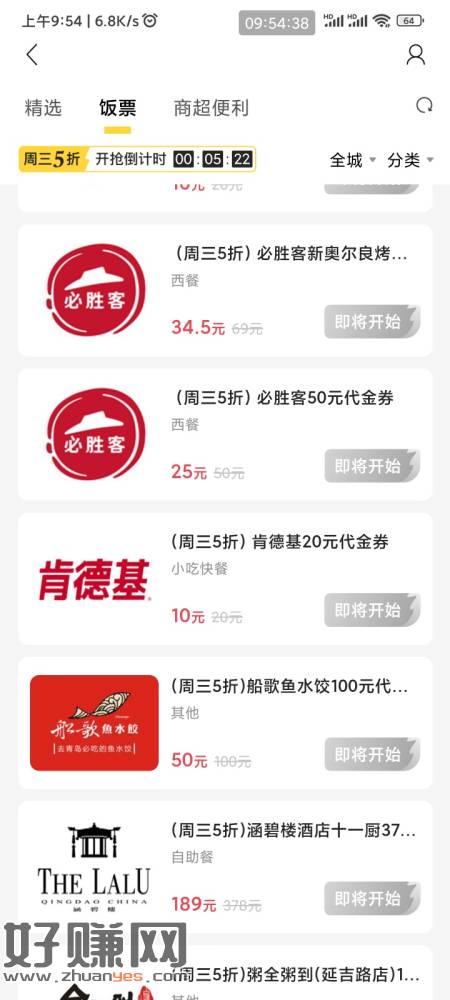 10点 招行APP-饭票 抢20喜茶和20肯德基 卖玖玖有润