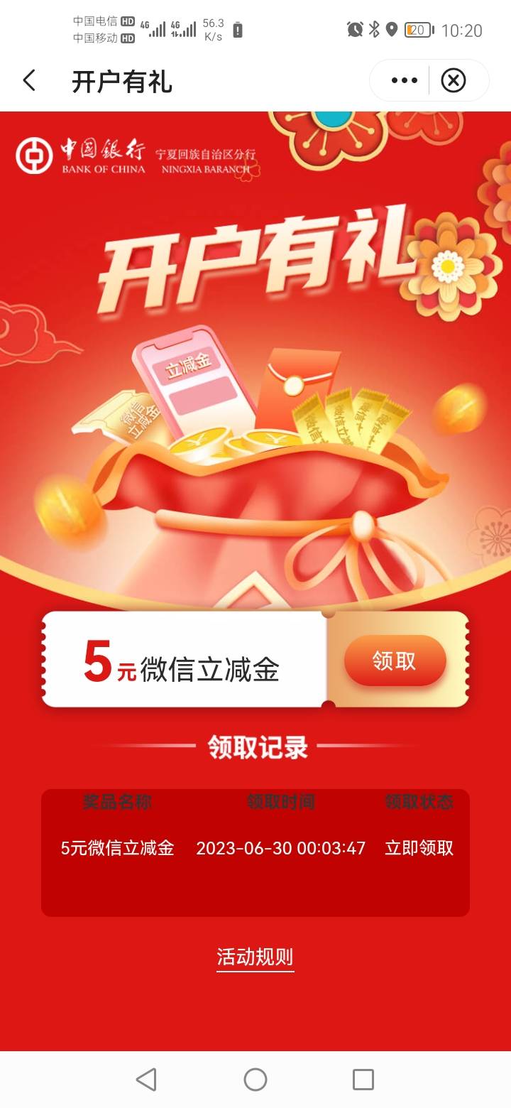 有宁夏中行的可以去拿10 新开的卡还有5 我是老号,只拿了10