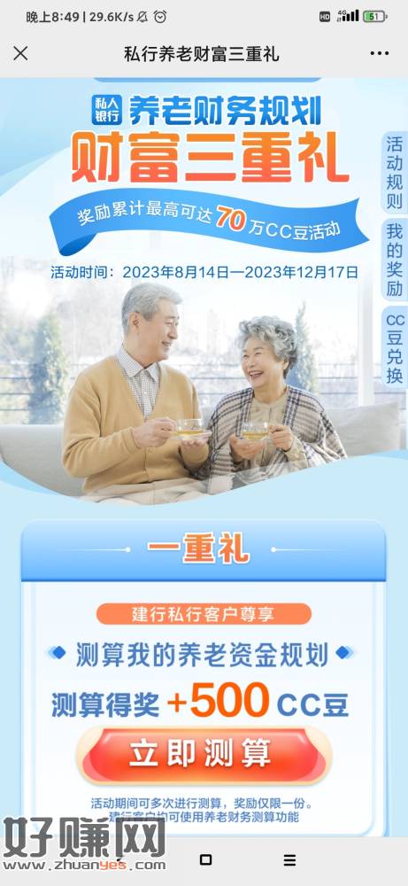 微信打开地址->随便选一下然后测算,等1~5天自动发放500CC豆,累计CC豆可兑换京东E卡、猫超卡等奖励