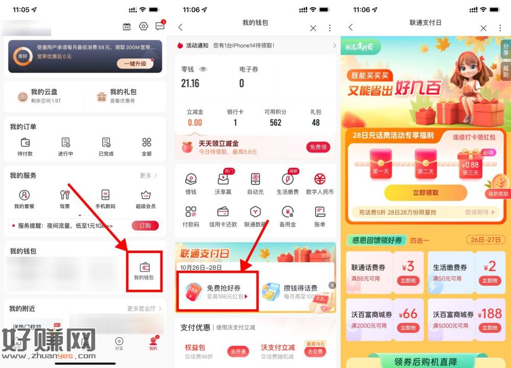 【联通支付日每天抽随机话费券】新一期!联通APP->我的->我的钱包->联通支付日->每天签到得随机话费券,第3天必得0.88元话费券