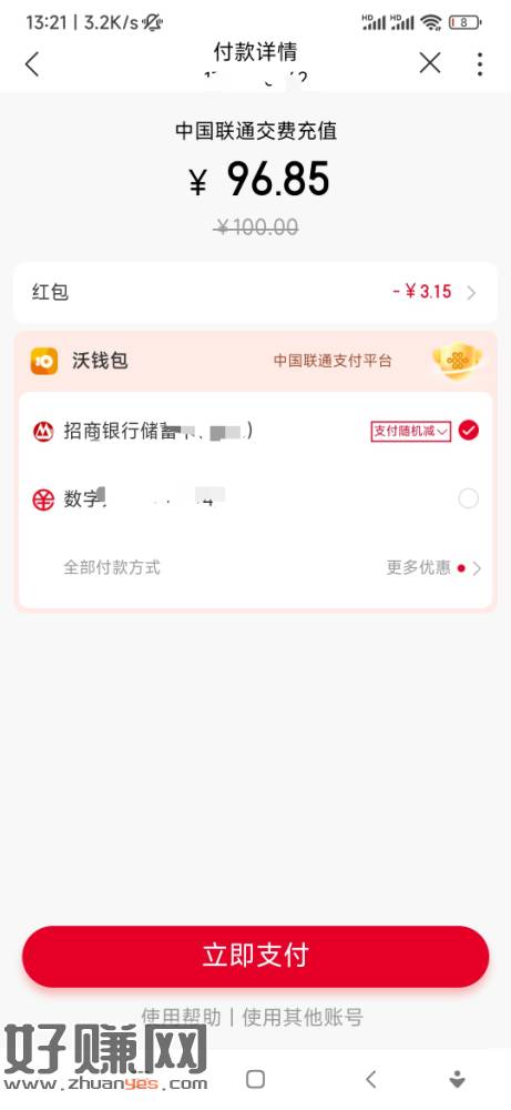 联通支付日每天抽随机话费券