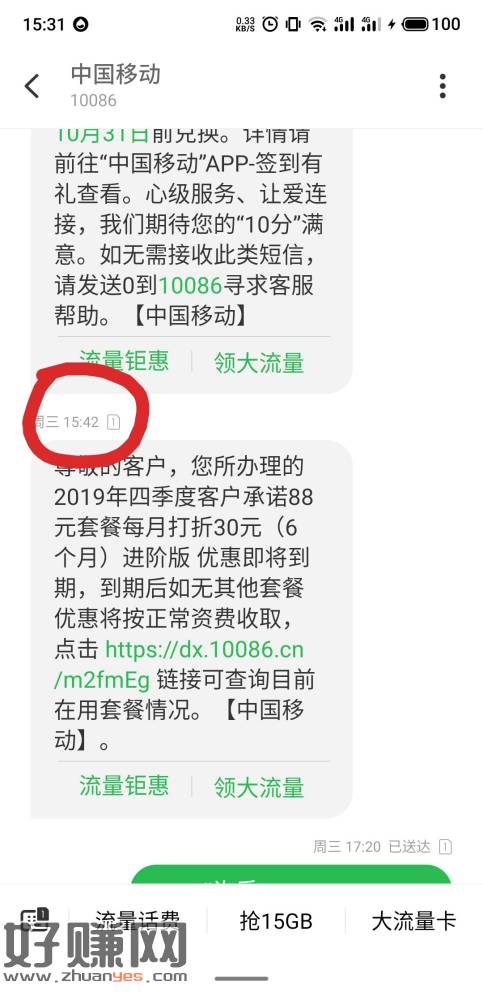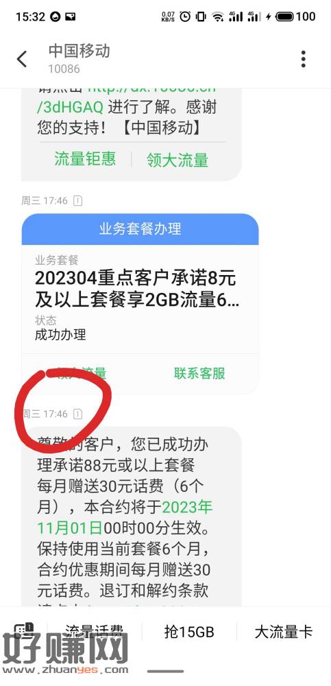 移动用户每月减免30/50话费,昨天17点20发的指令,17