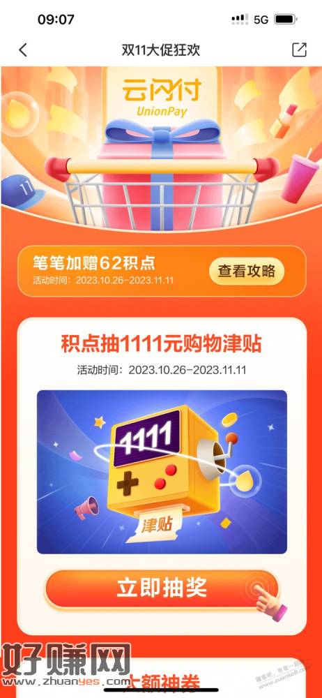 云闪付~我的会员中心~双11大促狂欢,62点抽一次,每天可抽三次。