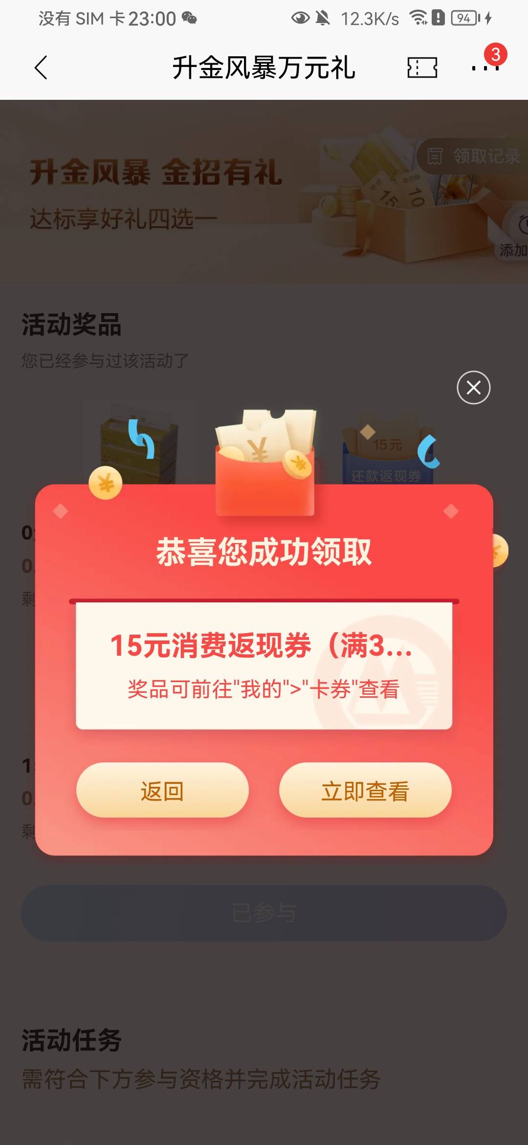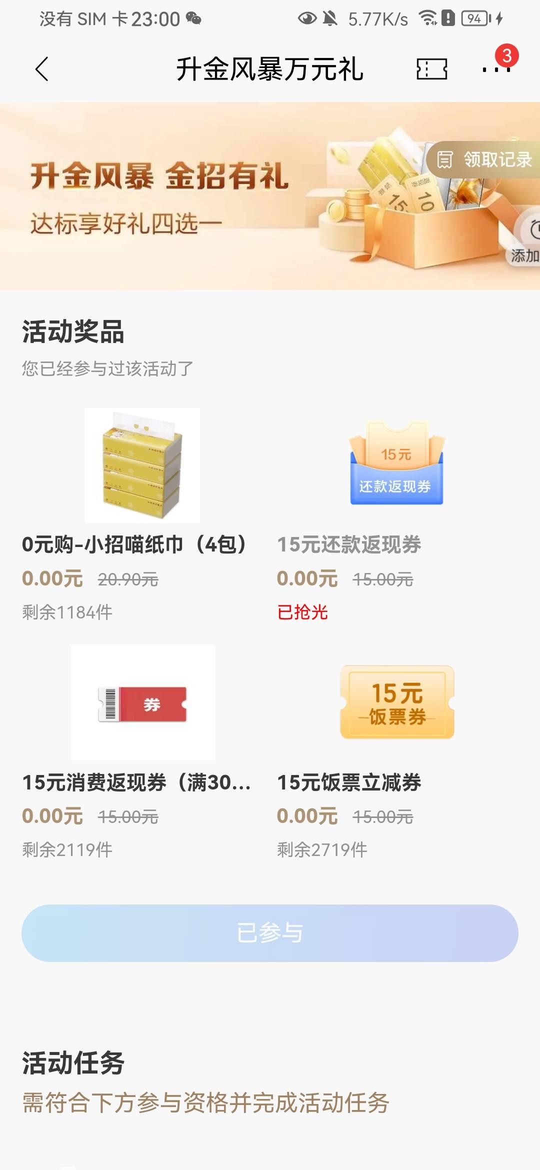 招行升金风暴万元礼,完成任务领奖
