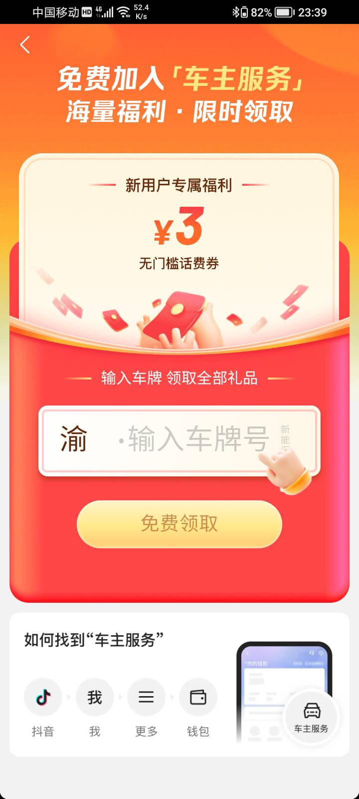 抖音我的钱包有个横幅 车主认证领3话费卷 乱填实测已到账。
