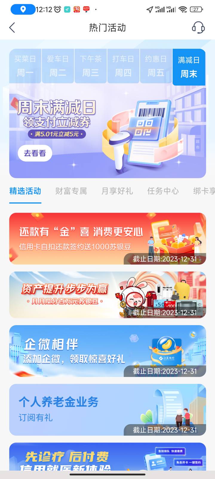 首发 江苏银行 热门活动 顶部周末满减日 每周六一张5毛立减券,被扫自动抵扣。二类户不确定能不能玩,老哥们自测。
