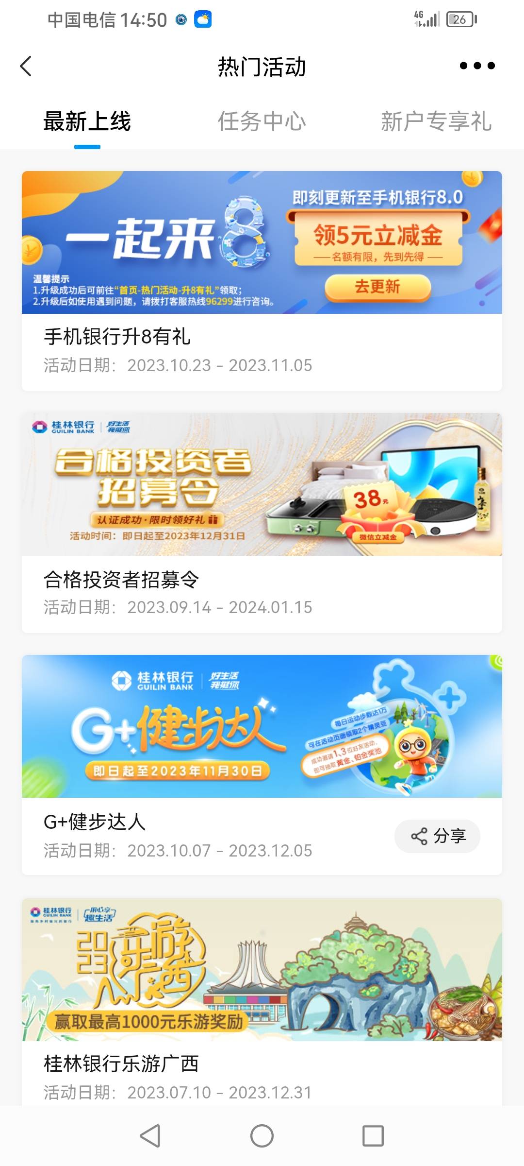 首发!桂林银行APP热门活动手机银行升8版本,领5元立减金。没有卡的可以去,桂林银行活动特别多。整个广西都有分行,广东深圳在罗湖区有分行,广东广州番禺区有分行,东莞南城,东城有分行。湖南长沙有分行,珠海也有