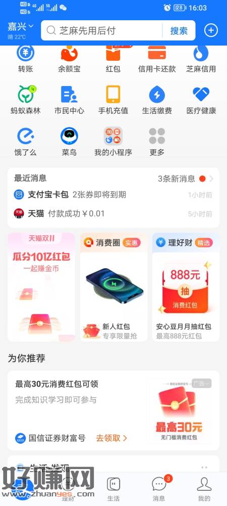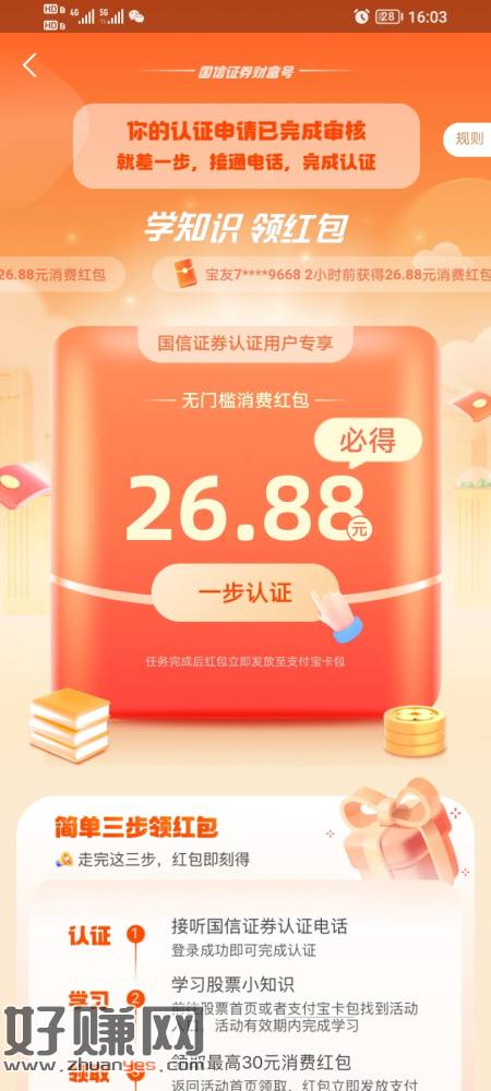 支付宝看看有没有,这个好像接个电话然后在学习股票知识就可以领取了