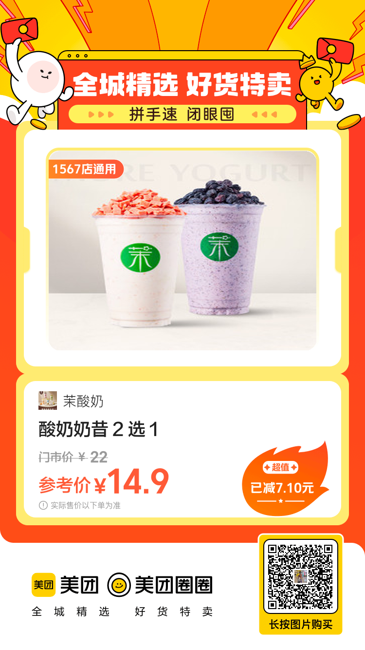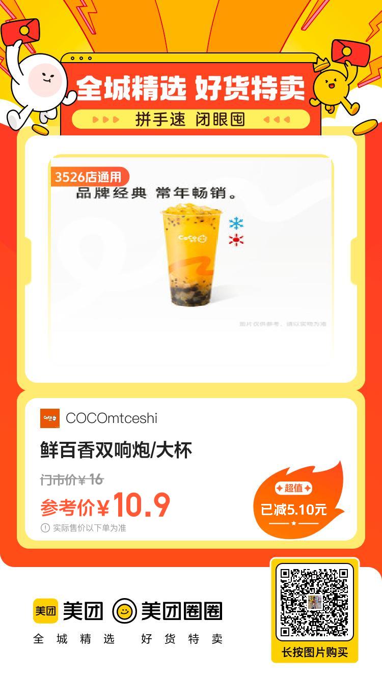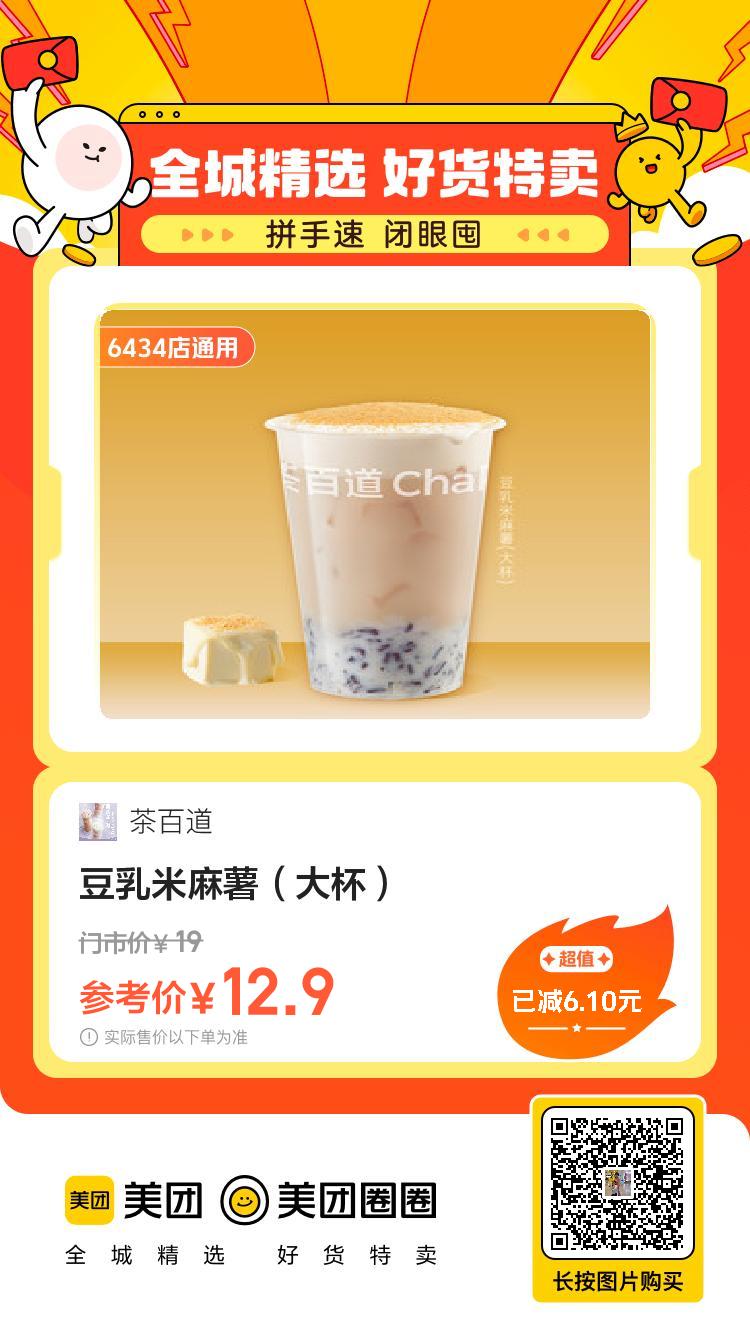 8.9,茶百道|【任选人气饮品】5选19.9,luckin c|爆款 20 选 19.9,NOWWA挪瓦咖|生椰拿铁8.9,爸爸糖手工吐司|【新品】金桂红豆吐司10.9,CoCo都可|鲜百香双响炮/大杯32.8,馬伍旺饮料厂|2 人【万圣节】经典CP组12.9,茶百道|豆乳米麻薯(大杯)64.9,良品铺子|70元代100元券