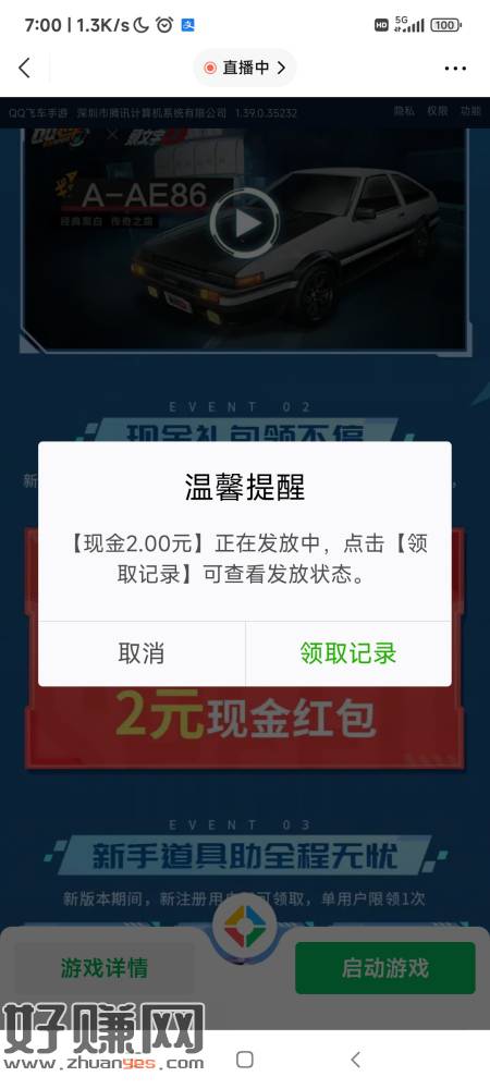 微信QQ车 秒玩换区后返回活动点“立即下载”取消 领取2元