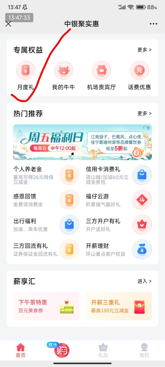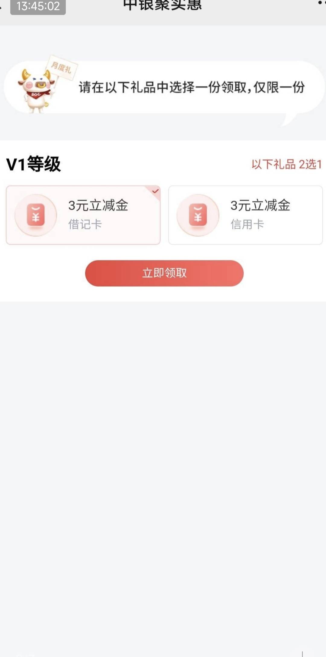 中行深圳分行。月度礼更新。 公众号进去下面,中间聚实惠。月度礼! 然后我的下面二选一。 有抽奖形式,储蓄卡和信用卡选其中一个,限深圳卡!