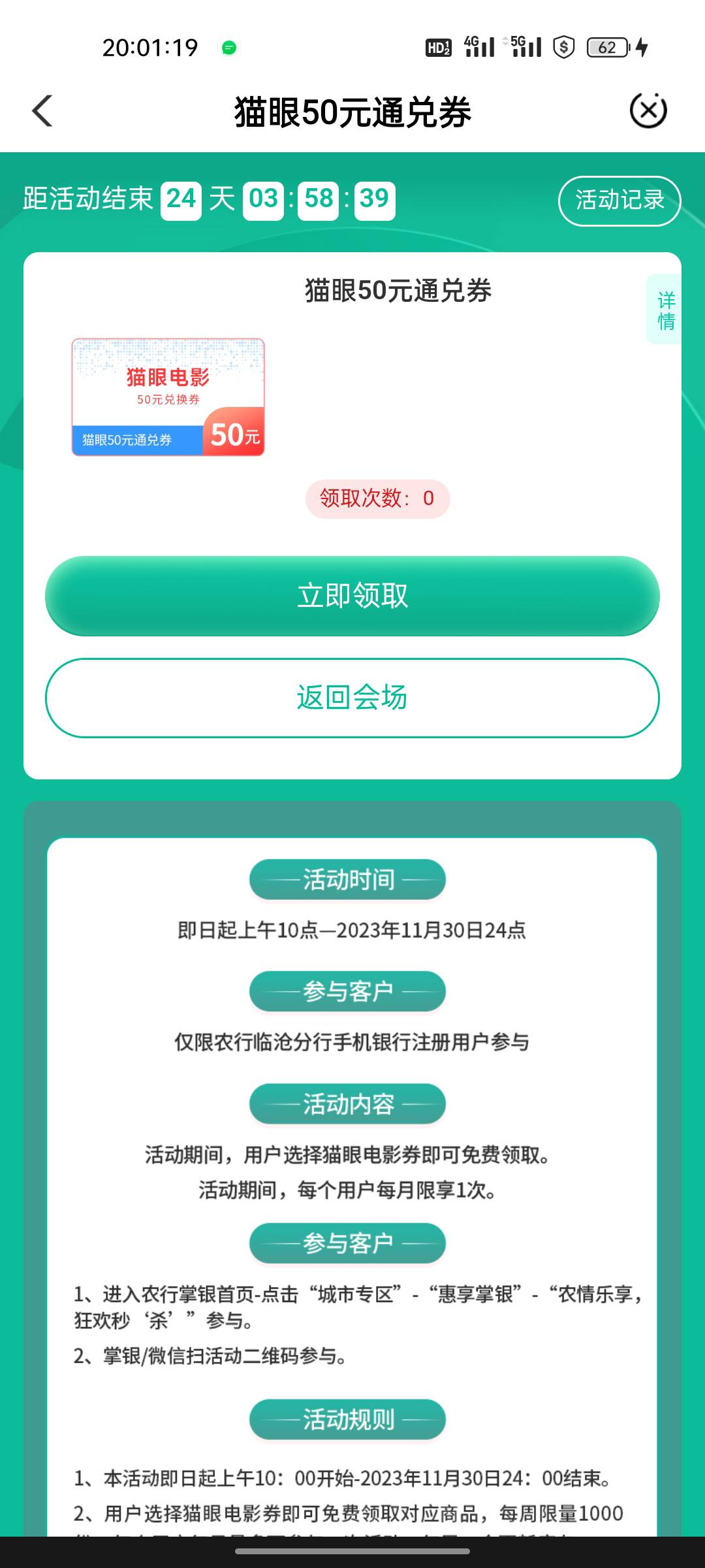 首发 云南临沧农行 代码241702 城市专区惠享掌银 两个活动。 第一个抽奖,实物限云南地区发货 第二个50猫眼劵。