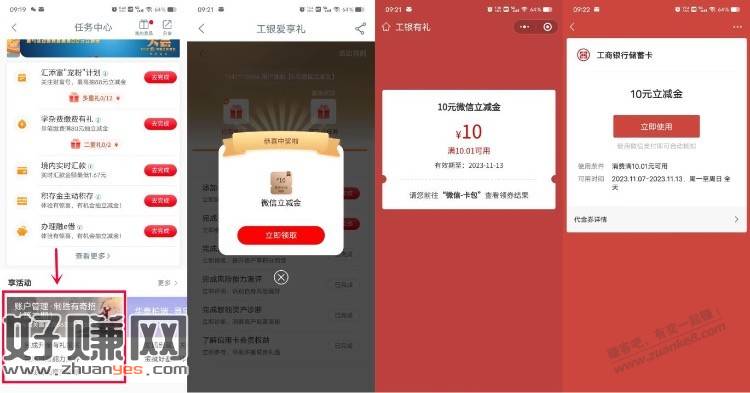 打开中国工商银行APP,搜索“任务中心”进去,下拉页面在享活动那里点击“账户管理制胜有奇招”进去,完成4个简单的浏览任务可以抽奖2次,刚中5+10元微信立减金,可以中多次,非必中