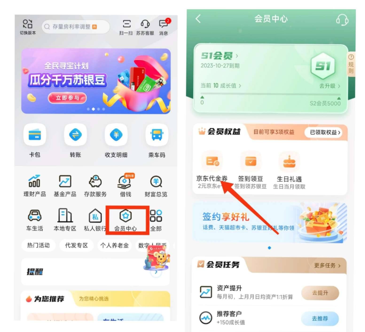 江苏银行会员中心领2元京东e卡,每月一次