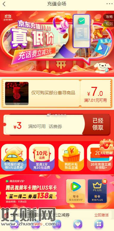 京东双11 满10-3元 话费充值券免费领