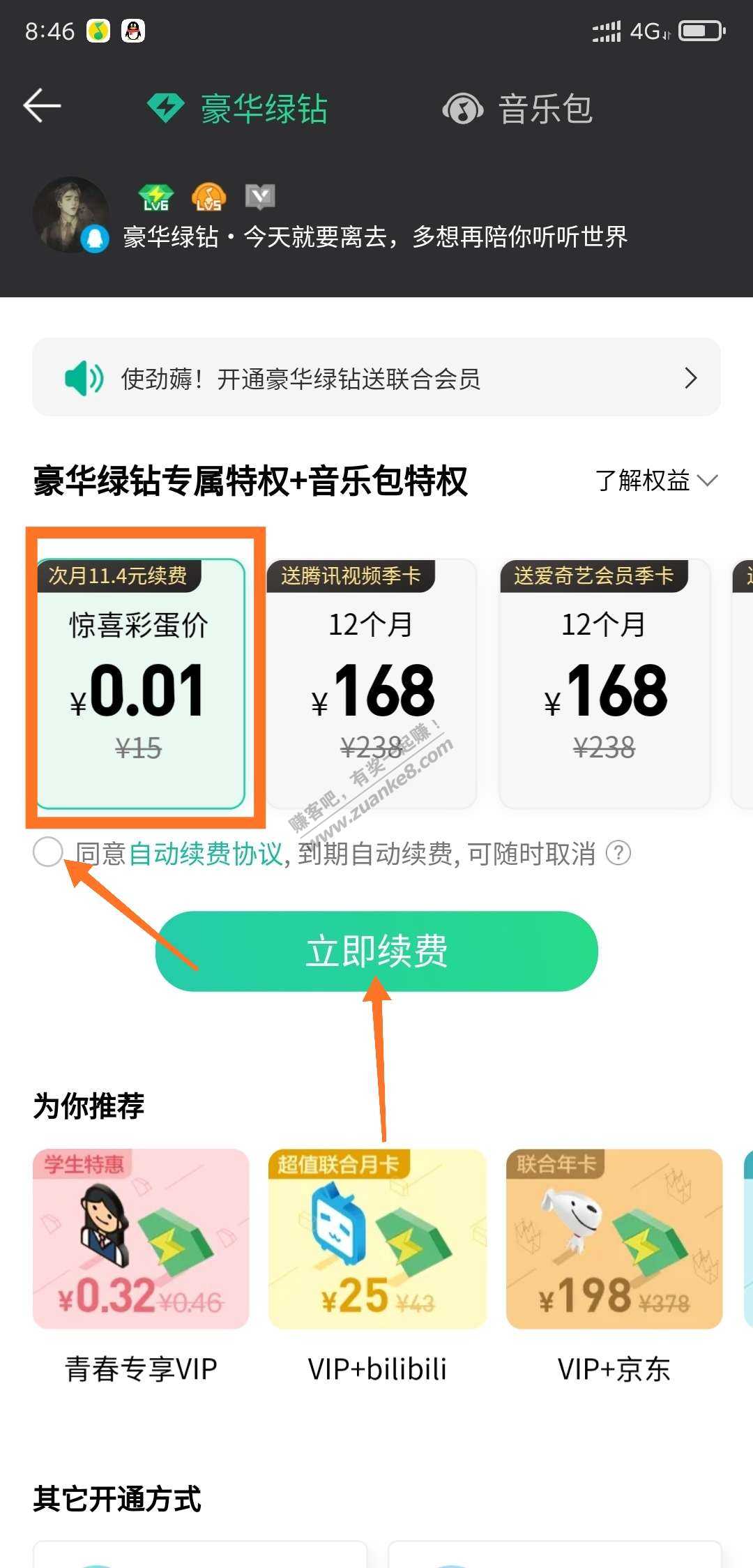 0.01撸QQ豪华绿钻一月