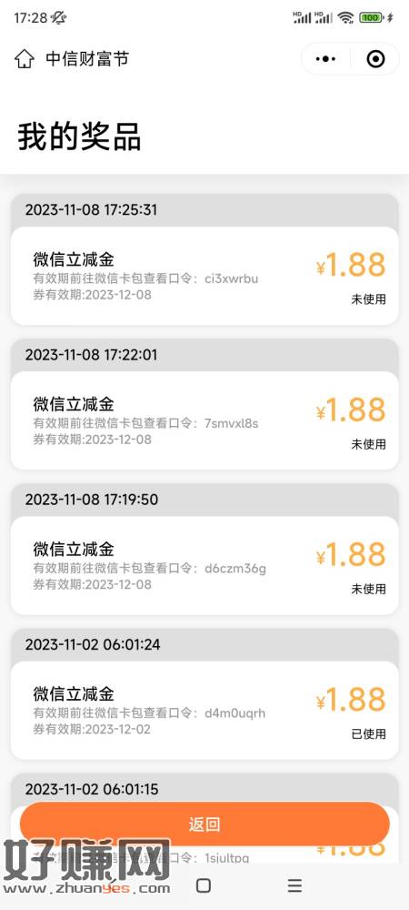 中信银行app-生活-中信财富节。抽奖,刚5中4。可jm撸,抽奖完退出活动重新进入换手机号就行。一微信好像可领10来个。
