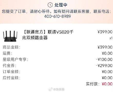 自测 联通app 搜路由器 点商品进去 下方有冲100送100券 叠加联通星级优惠3星可以0撸一个路由器