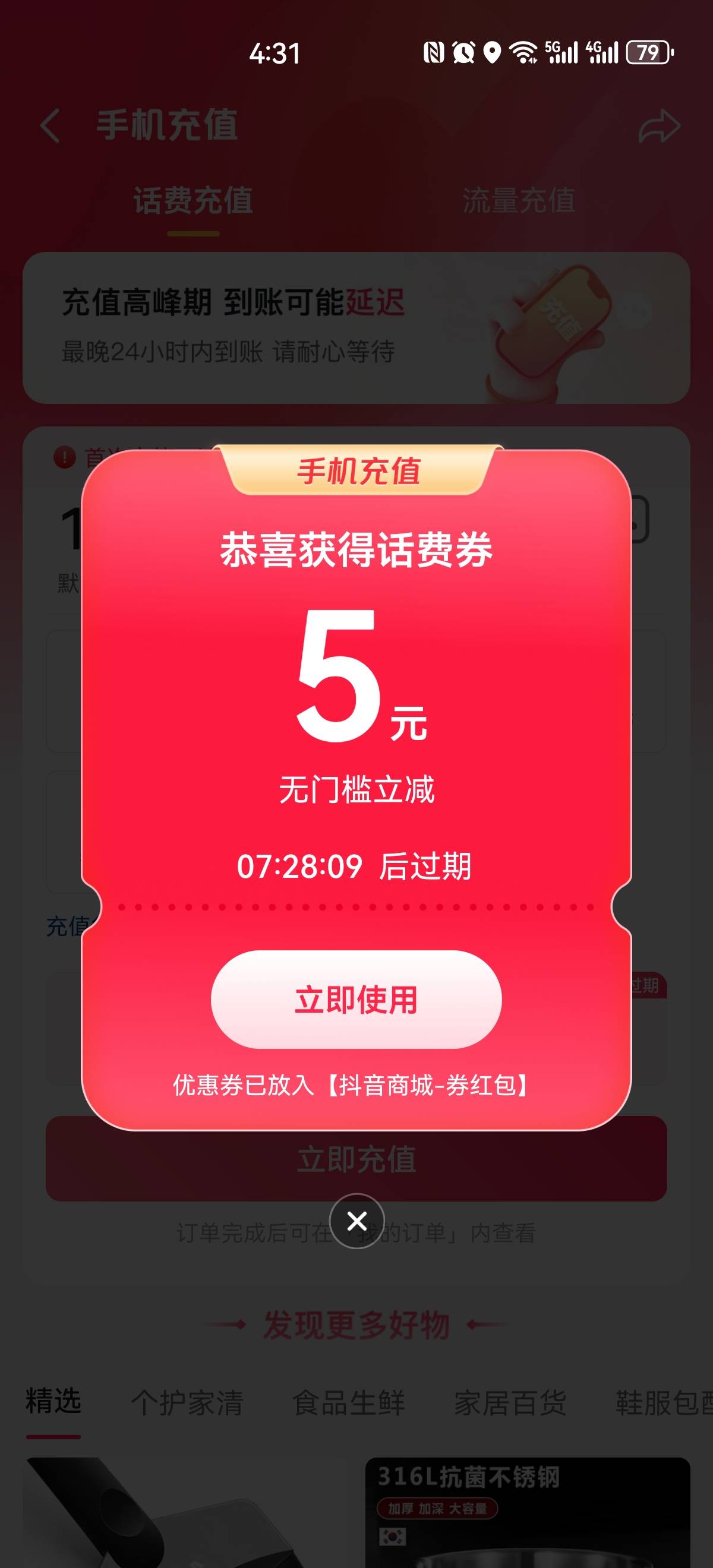 抖音-双11-手机充值弹窗5元话费券更新,商城5充10话费