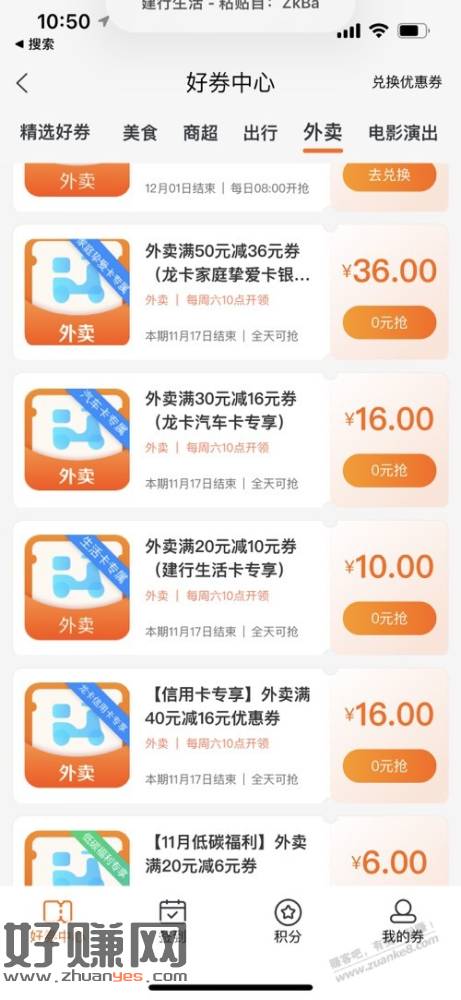 建行生活首页》好券中心〉外卖 20-10 46-16。