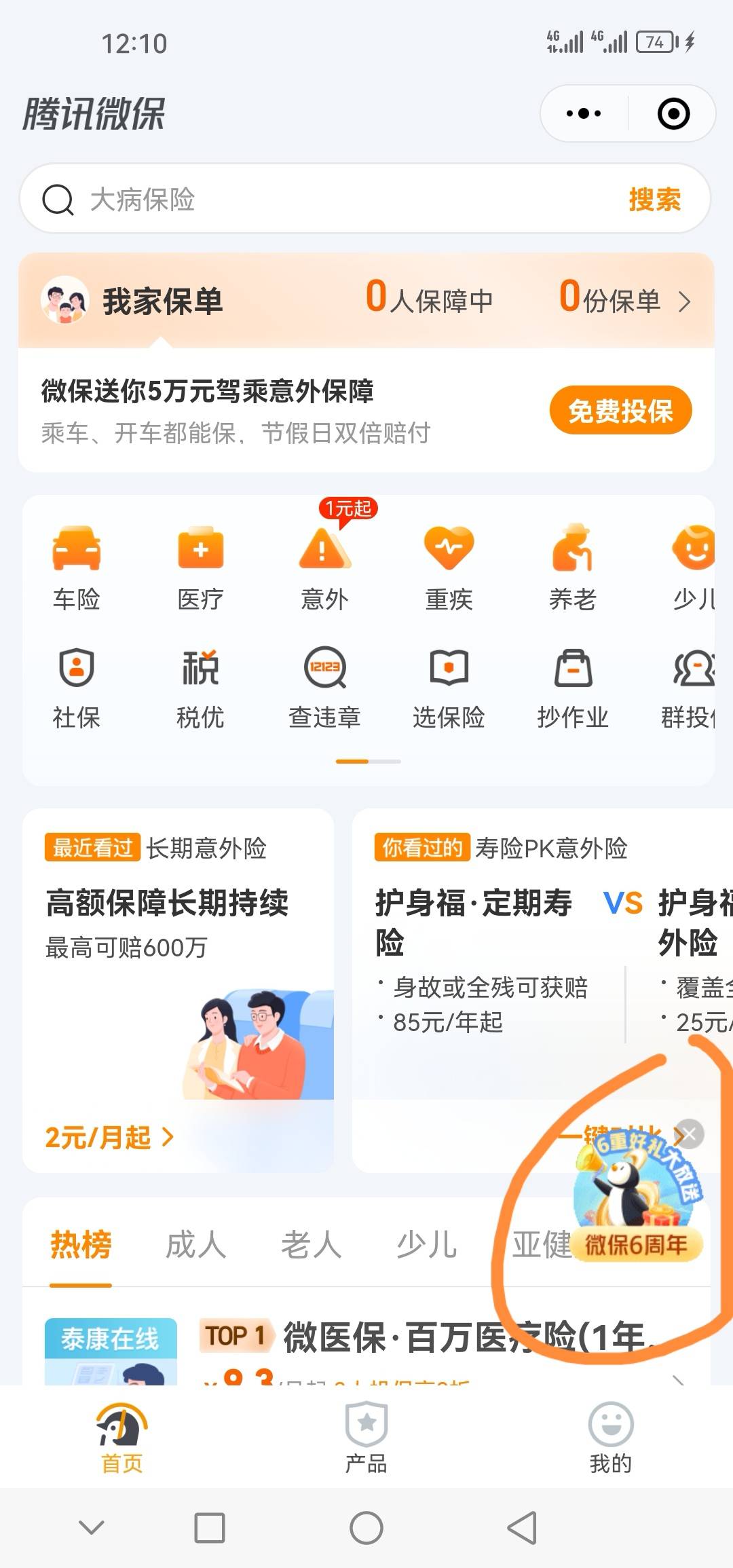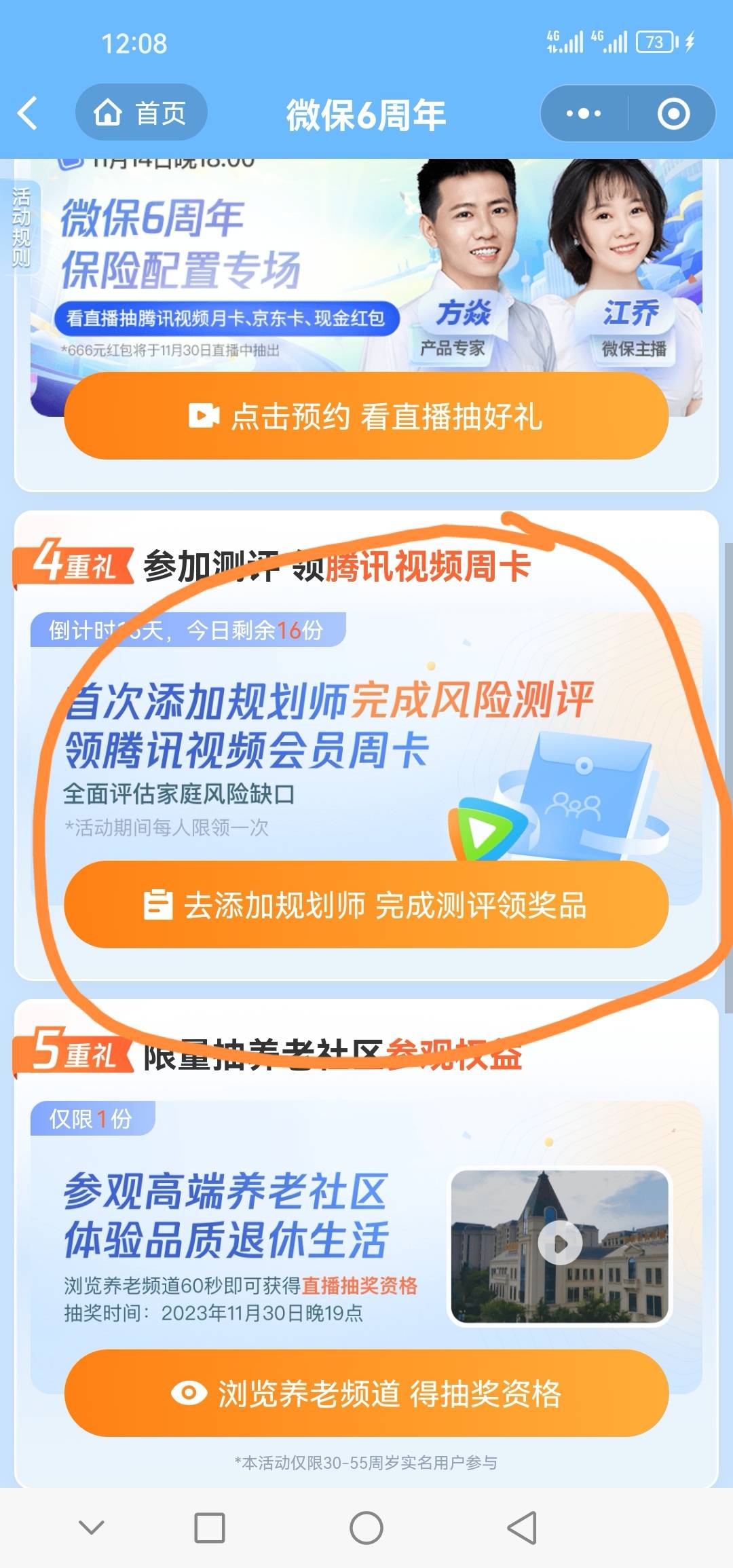腾讯微保小程序6周年活动,首次添加规划师完成风险评测抽奖