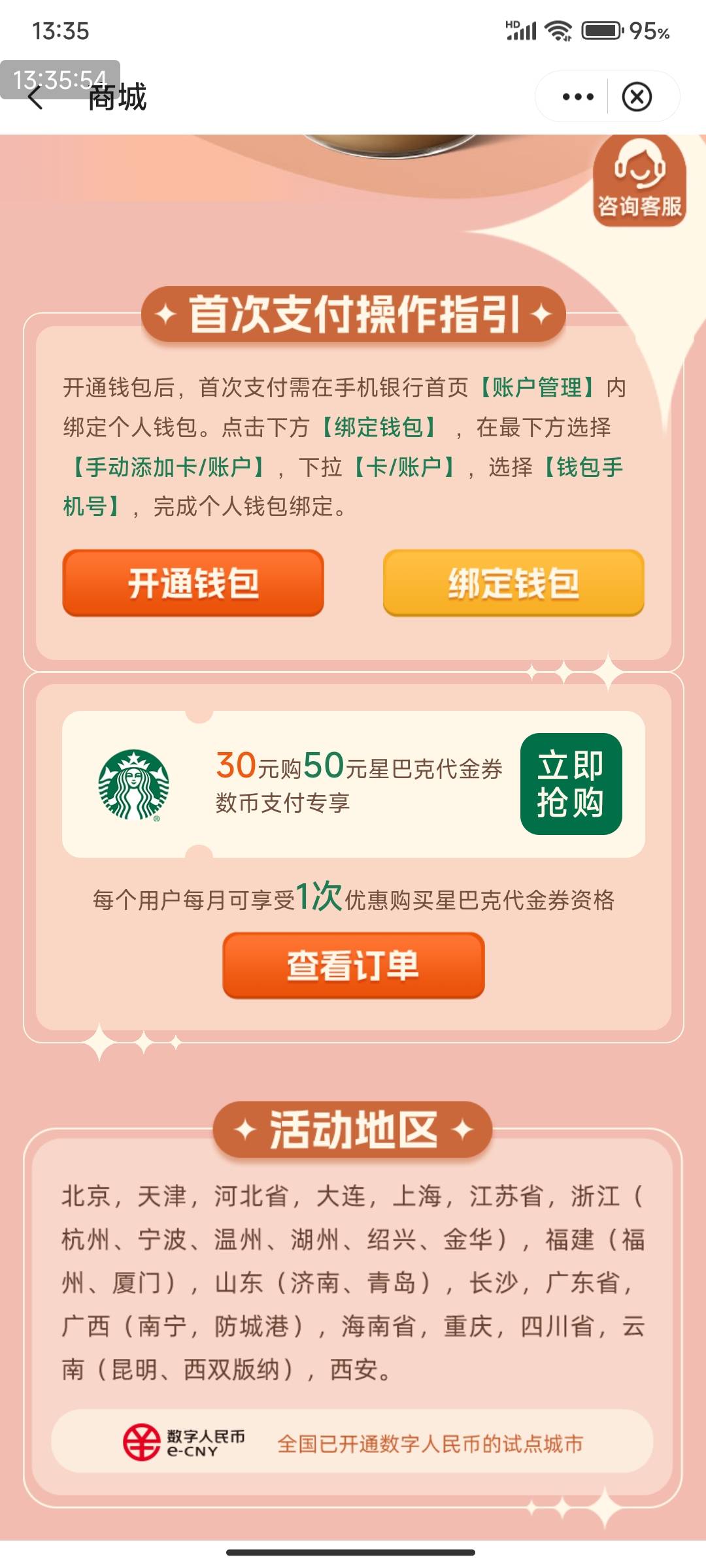 中行星巴克,试点地区都可以买!又可以买了,看图! 这个月在上海的订单,飞了几个地方, 也没换手机号,订单里不显示上一个订单了, 只有数字人民币支付记录能查到!这次继续购买! 出任意平台,我找个最低的都7.5利润!尽量找个高价的或者海鲜市场出,天气冷,自己喝也不错!