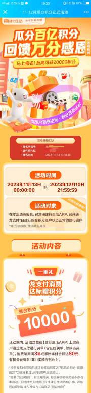 报名建行生活回馈百万积分活动!最高2w积分。大概33毛左右。祝大家好运