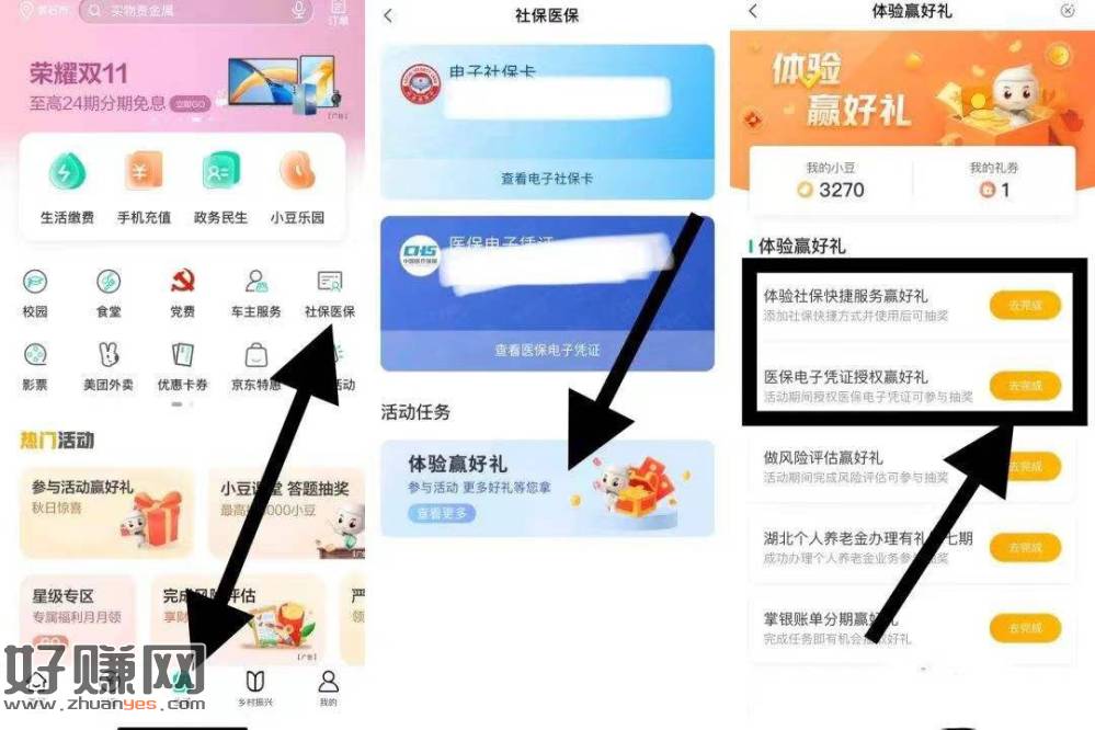 农行APP简单完成浏览2次任务就可以免费抽2次5—20元立减金!农行APP底部点击生活社保医保体验赢好礼简单完成社保医保添加桌面快捷方式就可以了,必中