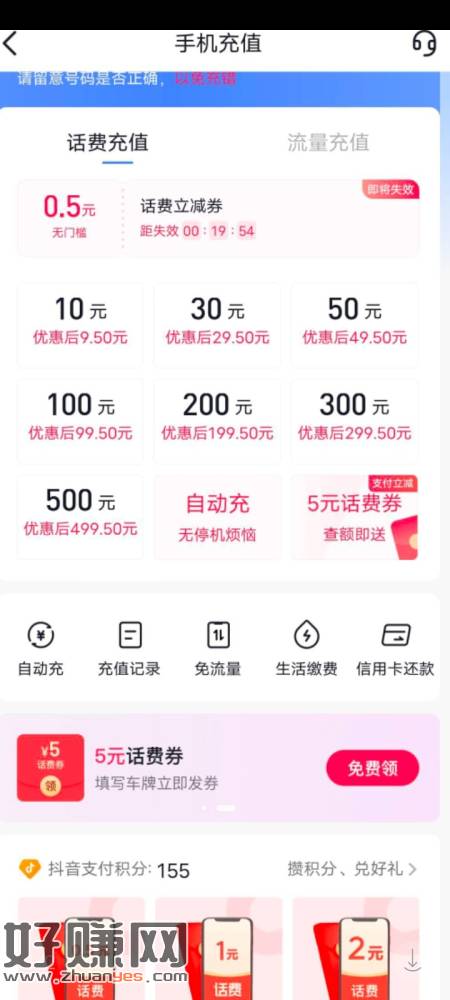 抖音钱包-手机充值,随便填车牌领5元话费券,充10话费-5元