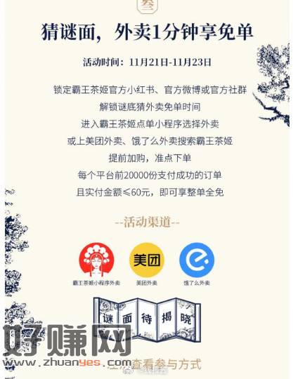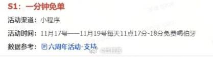 【霸王茶姬免单】11月17号11月19号每天11点17分-18分免费喝伯牙,饿了么和美团免单时间待定