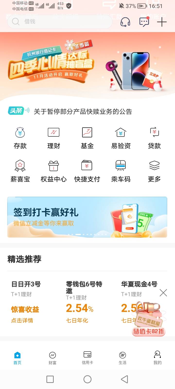 杭州银行首页横幅,签到打卡赢好礼