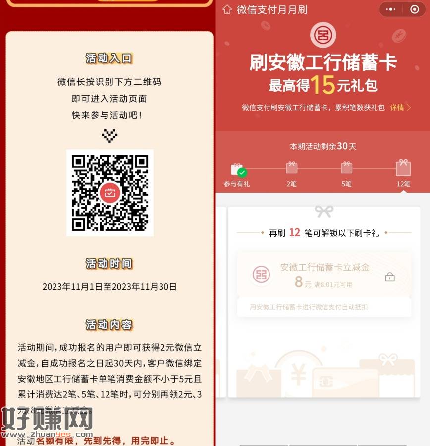 【工行微信月月刷】尊敬的客户,即日起至11月30日,安徽工行储蓄卡客户微信关注“中国工商银行客户服务”公众号,在对话框输入“安徽月月刷”参加安徽分行储蓄卡微信支付月月刷活动,扫码成功参与活动即可领取1张2元微信立减金,消费达标后更有机会额外领取共计13元微信立减金,详情请见活动页面。名额有限,先到先得。【工商银行】