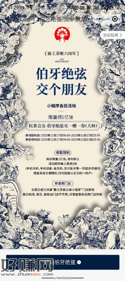 霸王茶姬小程序弹伯牙绝弦买一送一券