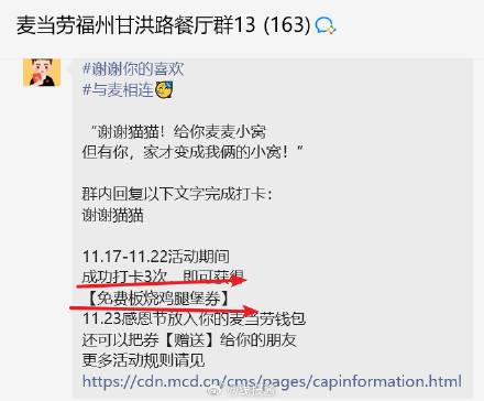 反馈麦当劳社群,打卡三天有免费送板烧,一般门店首次进群还有一杯喝的