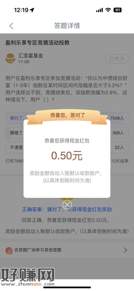 打开工商银行APP顶部搜索【财富社区】进入底部滚动图片【盈利乐享超90%】进入点底部文字最后一个,然后回答第一个汇添富基金的问题,答案选第一个。