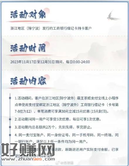 浙江地区除宁波,霸王茶姬支付宝线上小程序点单使用支付宝绑定浙江地区 (除宁波外) 工商银行借记卡 (卡号第7-8位为12),单笔消费可享满30元立减15元优惠(15元封顶)。可叠加今天领的买一送一券,