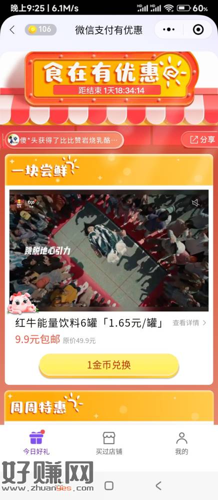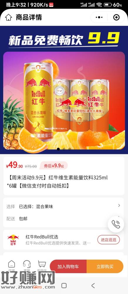 红牛---功能性饮料,微信支付1金币兑换6罐9.9包邮