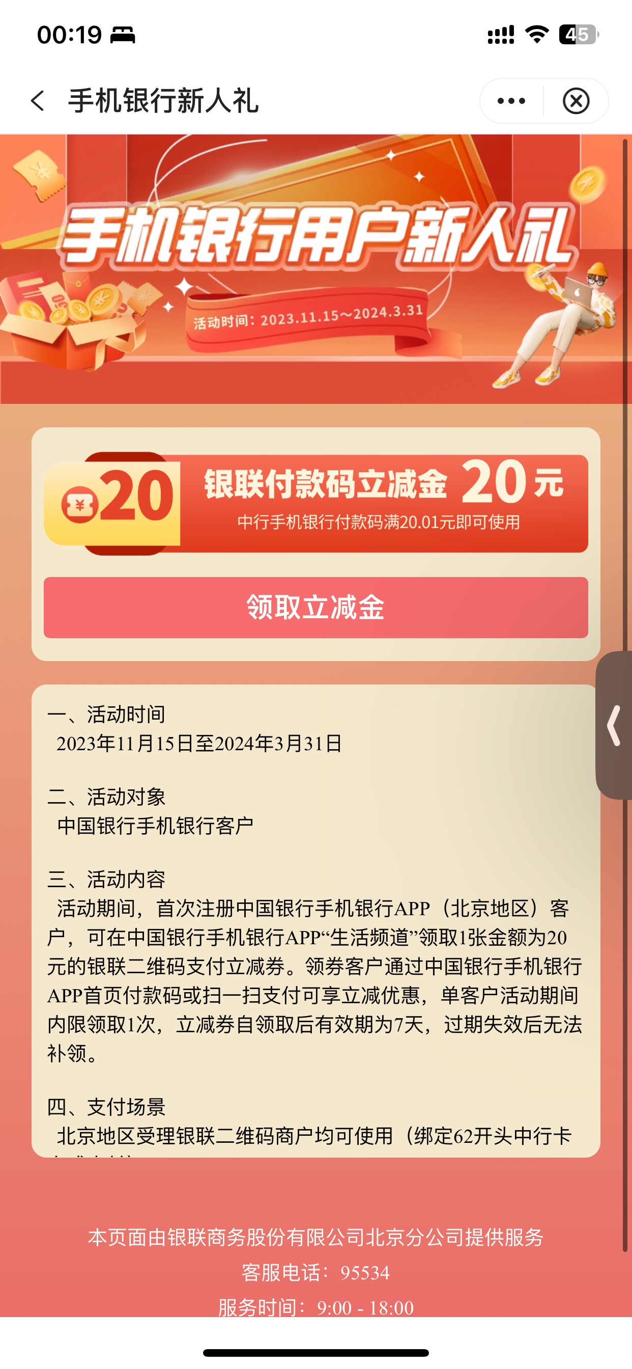 中行北京本地专属,手机银行新人礼领20元银联立减券