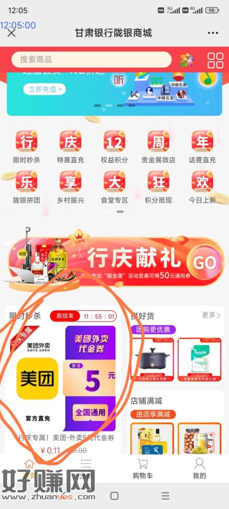 甘肃银行公众号0.11买5美团直充,用零钱支付。立减金要有卡。