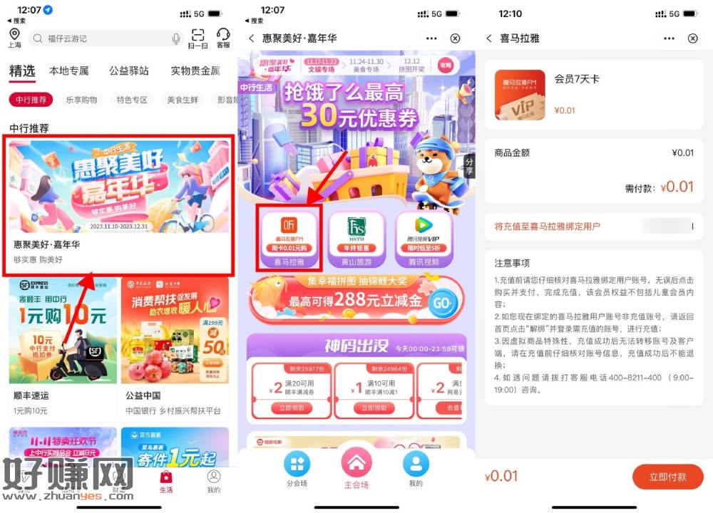 中行APP底部“生活”->下拉进入嘉年华->滑动找到喜马拉雅进入,再点击横幅进入0.01开7天会员