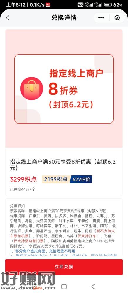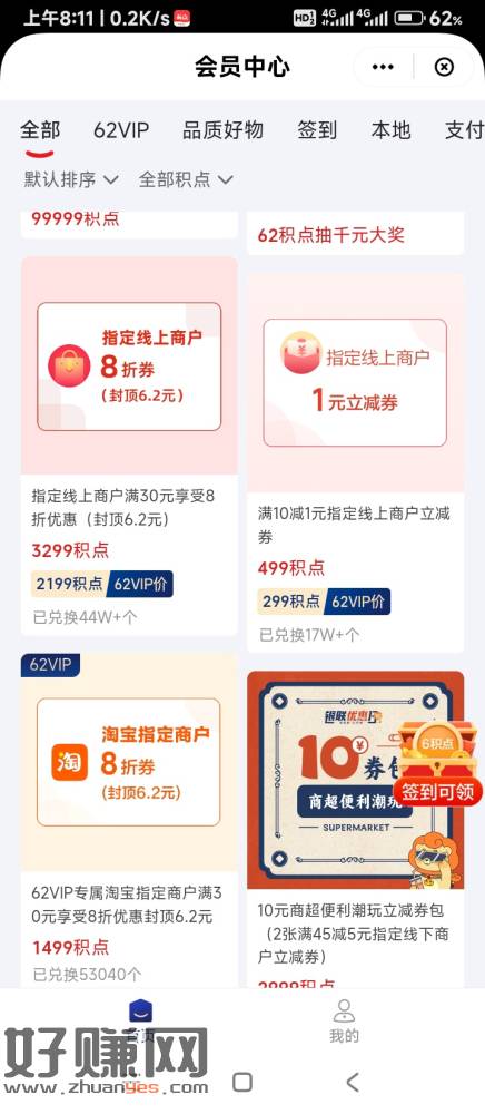 新的一周开始了,云闪付2199积点兑换6.2元券,每周一次,