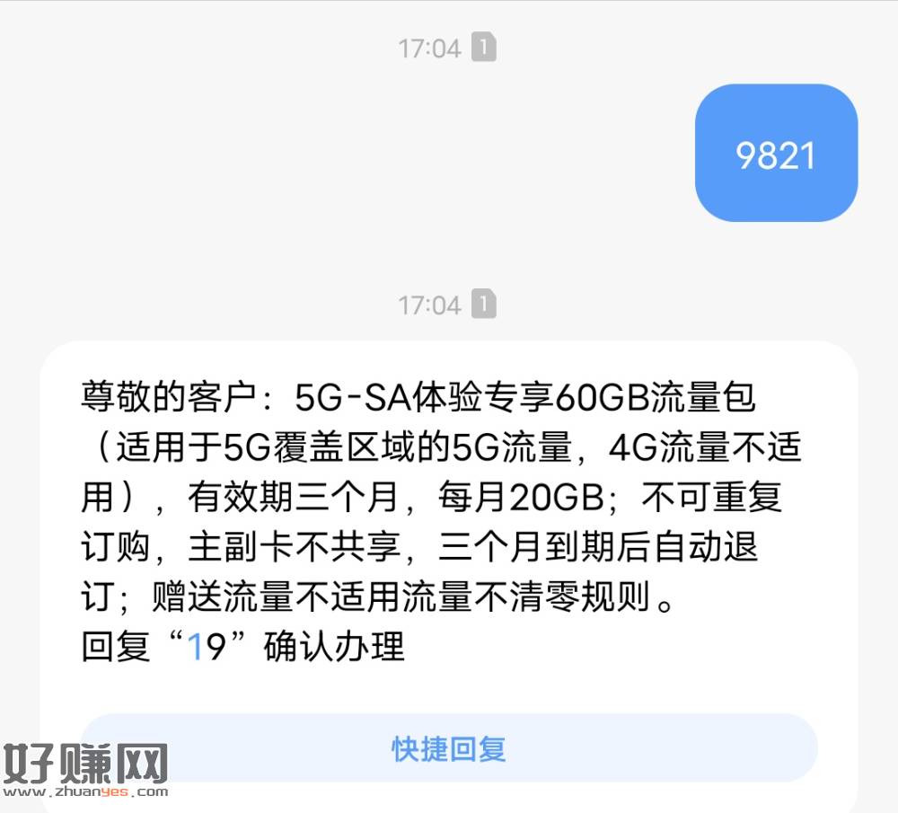 60g流量,限湖南电信!!!打开信息→发送9821到10001,回复19即可