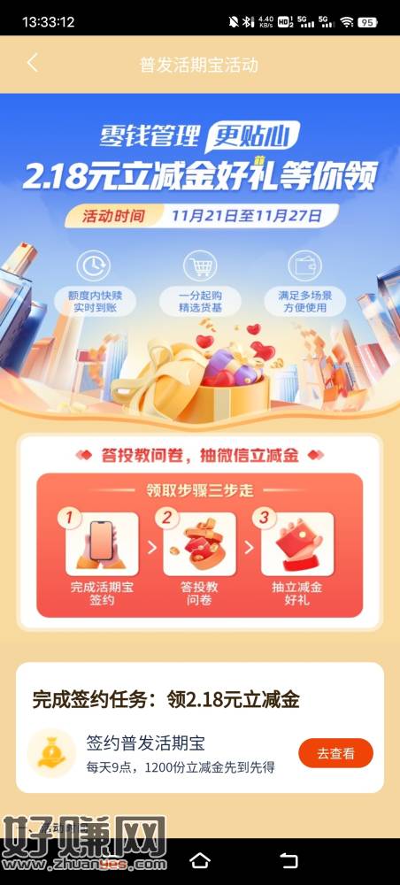 浦发银行社区零钱管理签约立即赎回0.1即可。