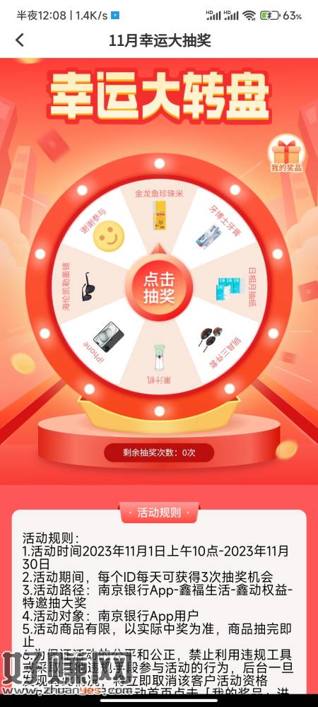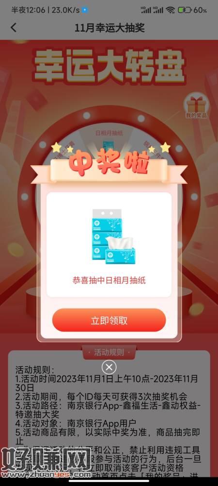 南京银行APP,首页,鑫福生活,鑫动权益,特邀抽大奖,刚中纸